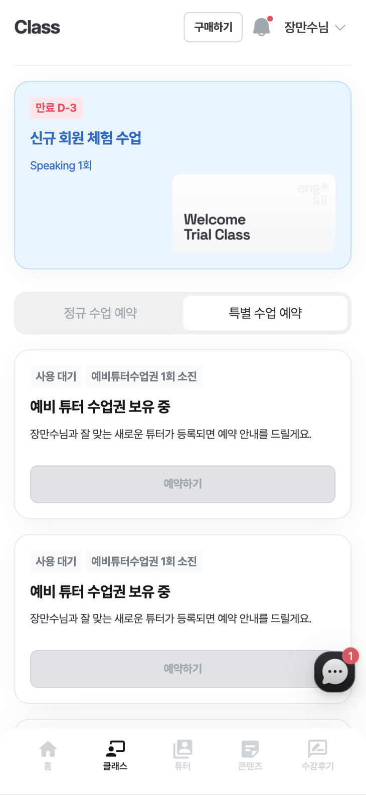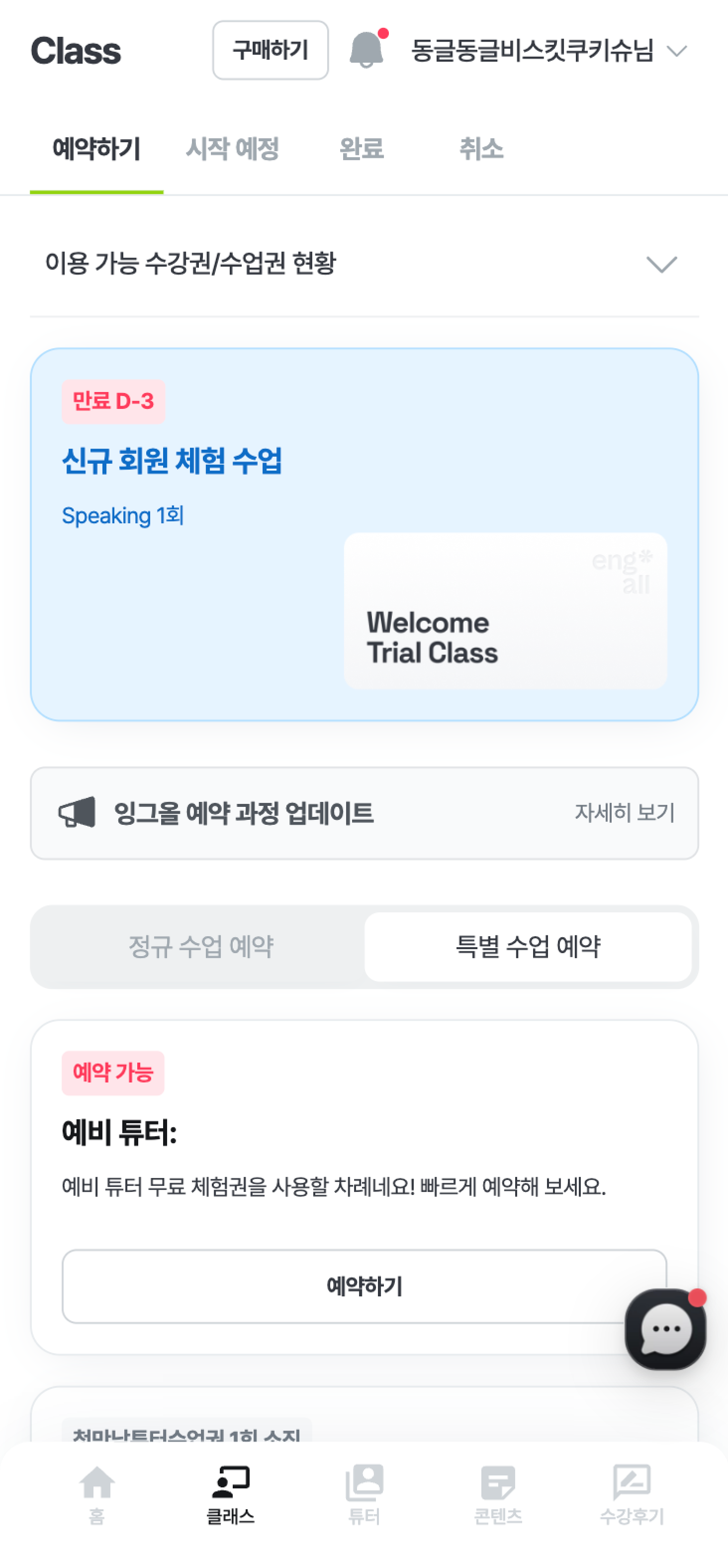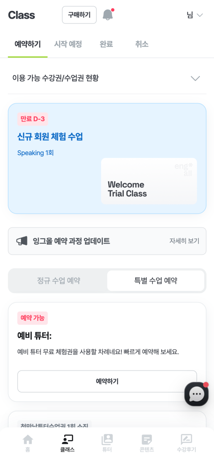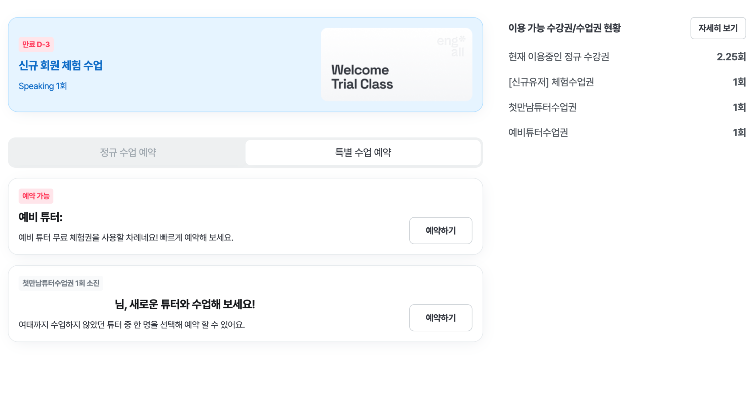 '특별 수업 예약' 탭에서는 예약 가능한 특별 수업의 리스트를 확인 할 수 있어요. 예약 가능한 특별 수업 리스트는 보유 중인 특별 수업에 따라 달라질 수 있어요.