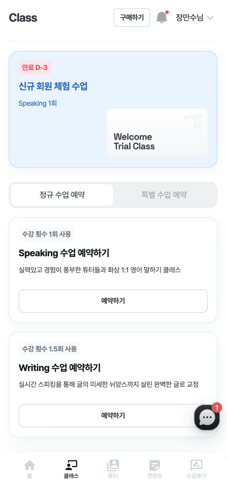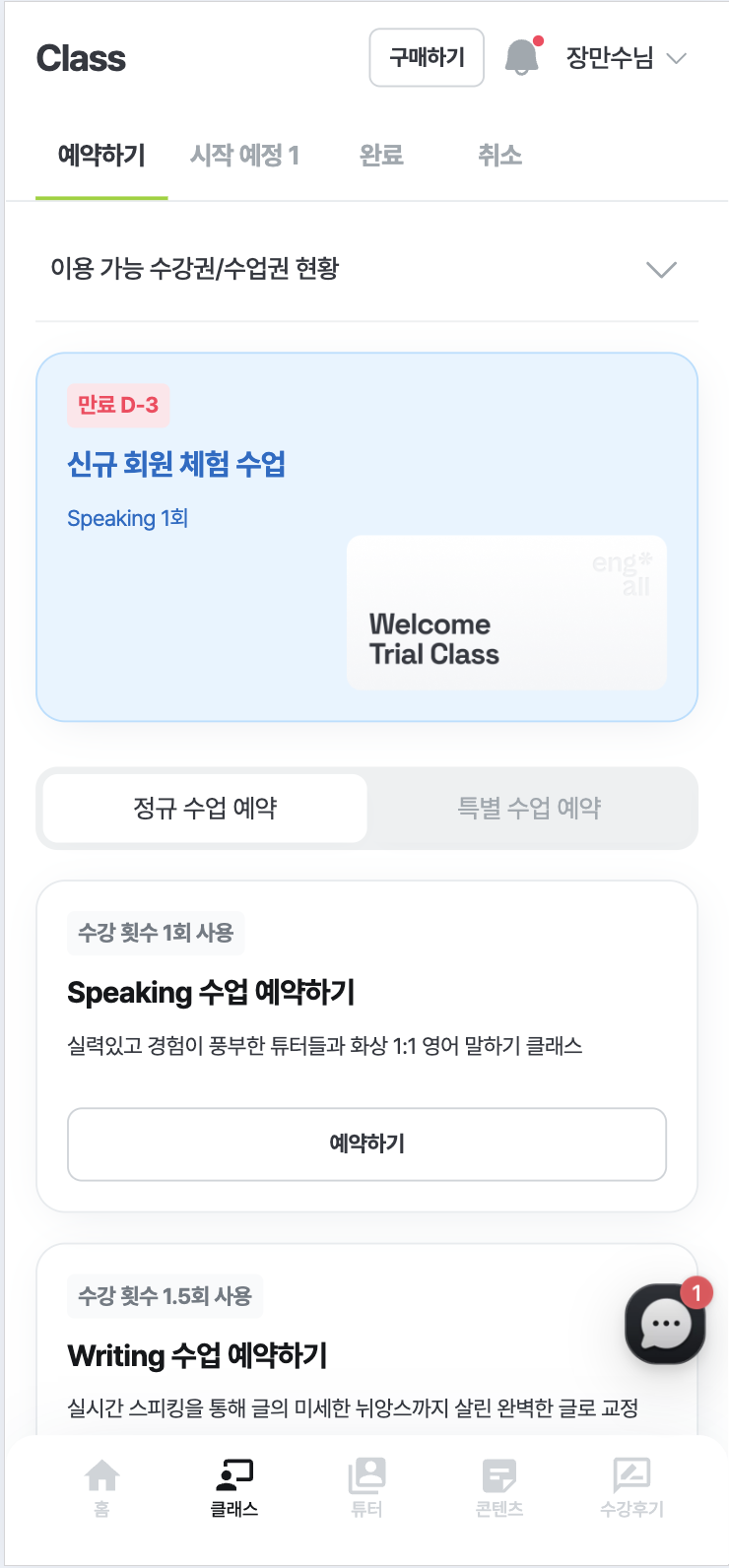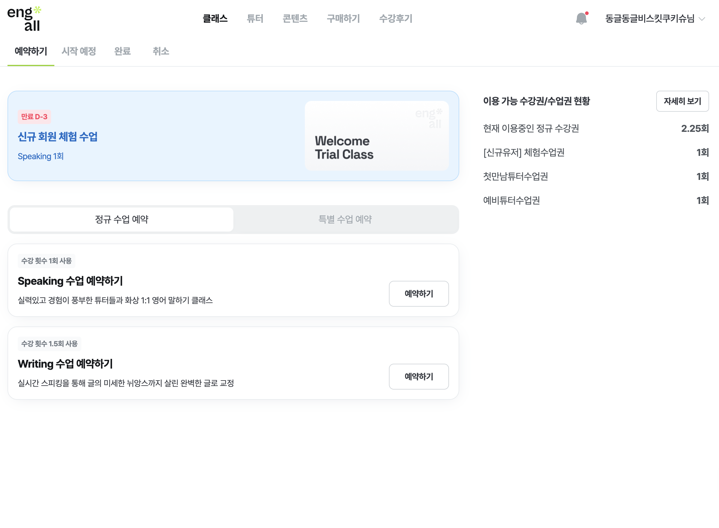 '특별 수업 예약' 탭에서는 예약 가능한 특별 수업의 리스트를 확인 할 수 있어요. 예약 가능한 특별 수업 리스트는 보유 중인 특별 수업에 따라 달라질 수 있어요.
