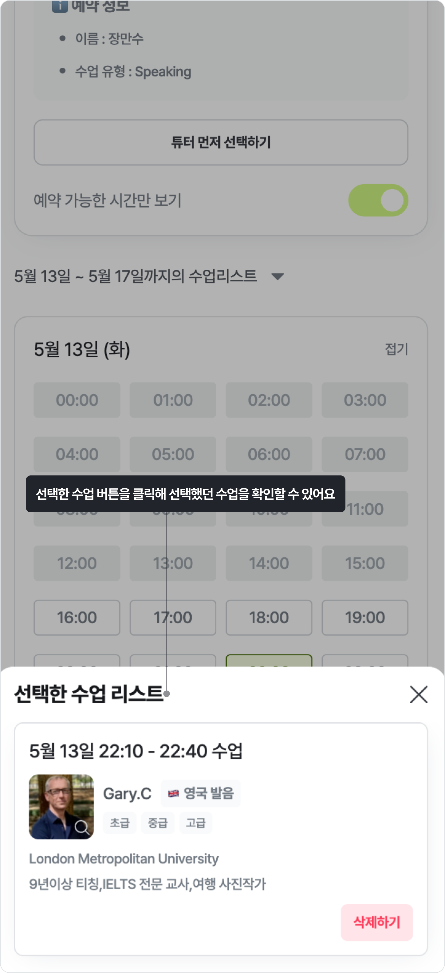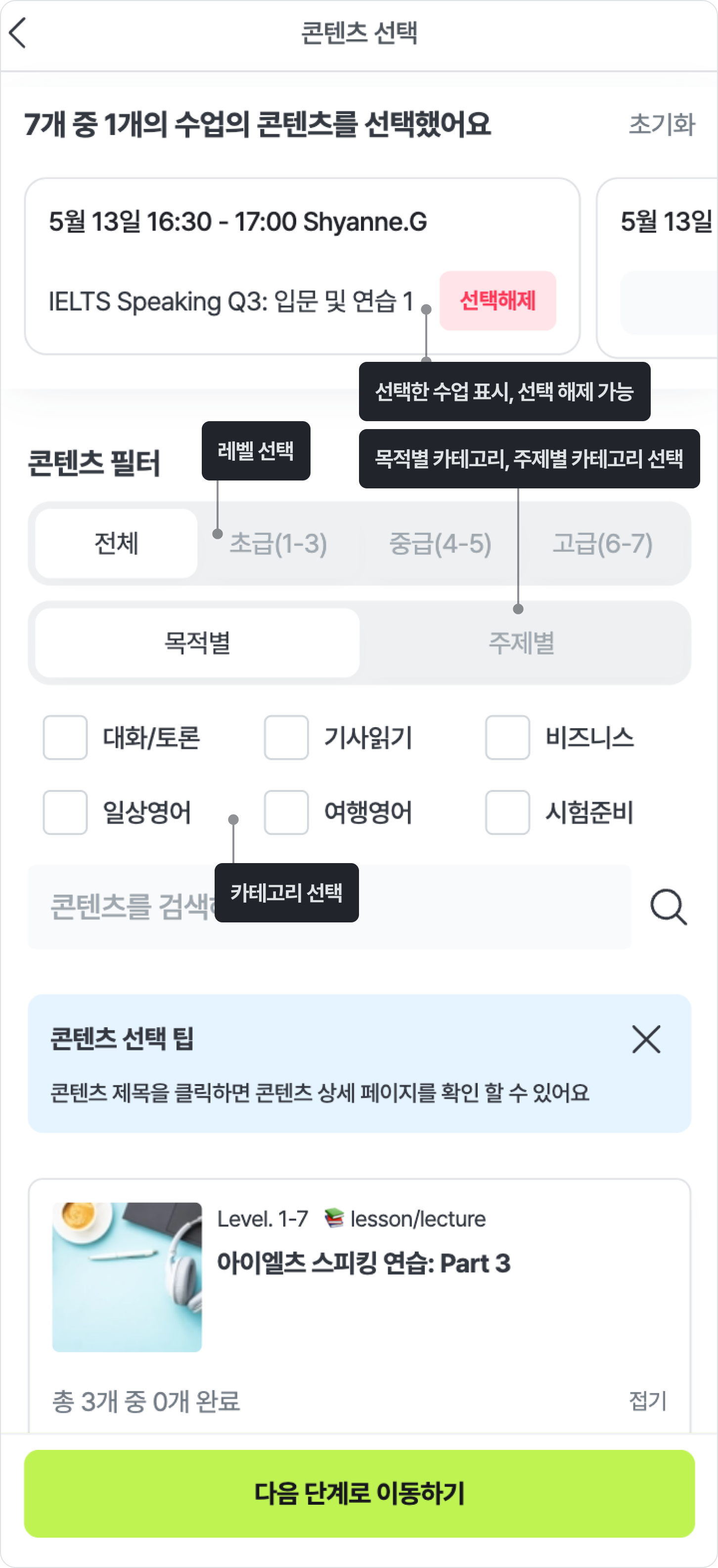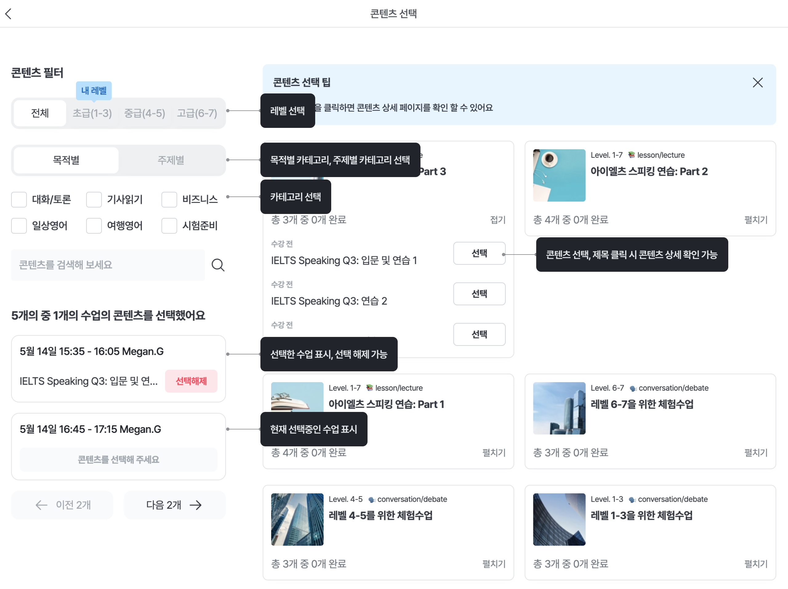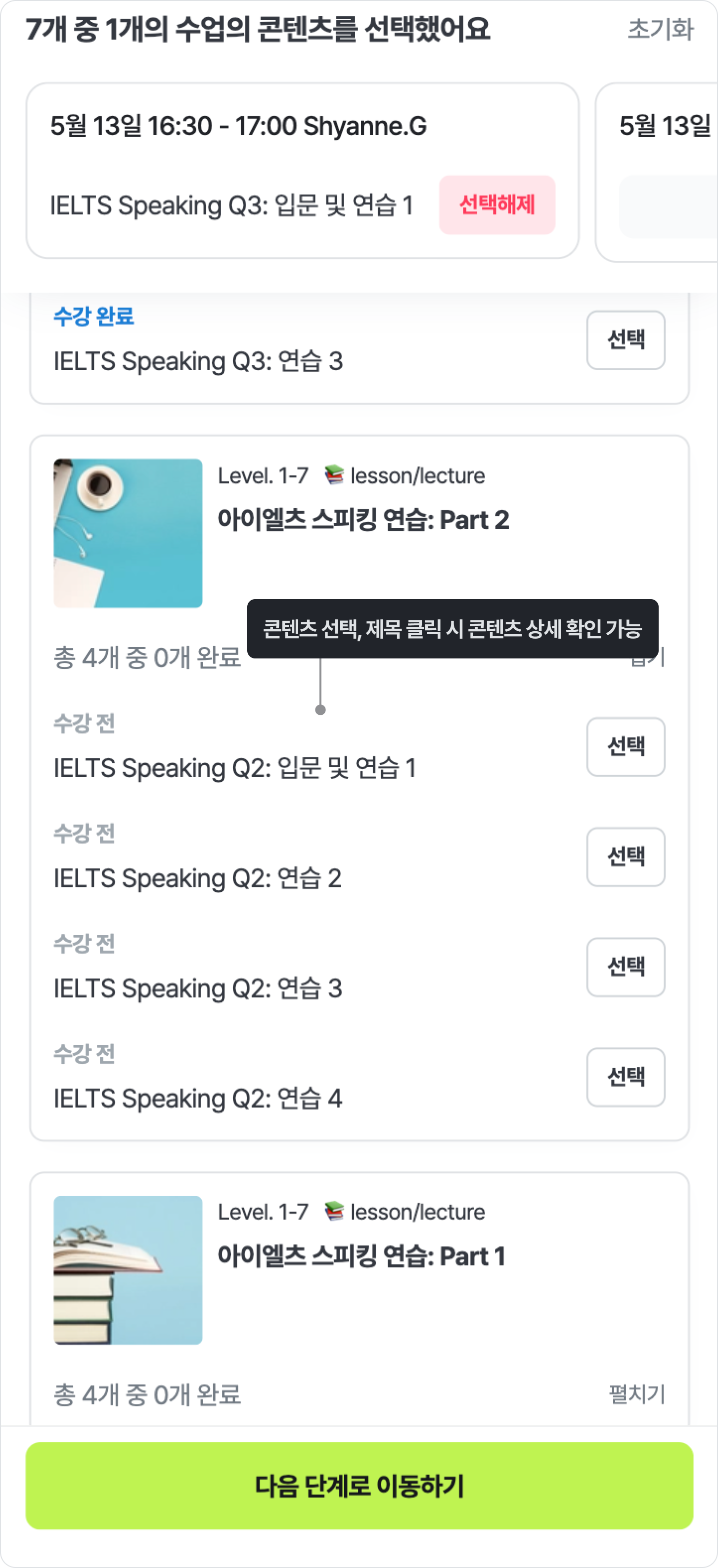 '특별 수업 예약' 탭에서는 예약 가능한 특별 수업의 리스트를 확인 할 수 있어요. 예약 가능한 특별 수업 리스트는 보유 중인 특별 수업에 따라 달라질 수 있어요.